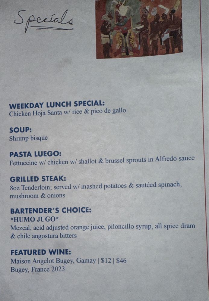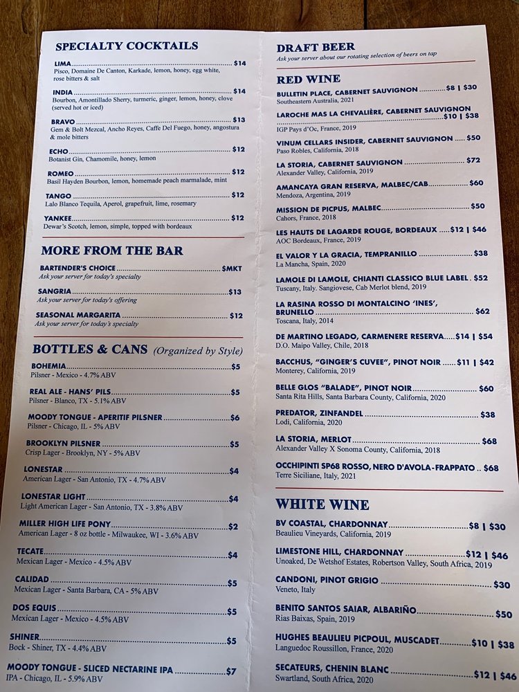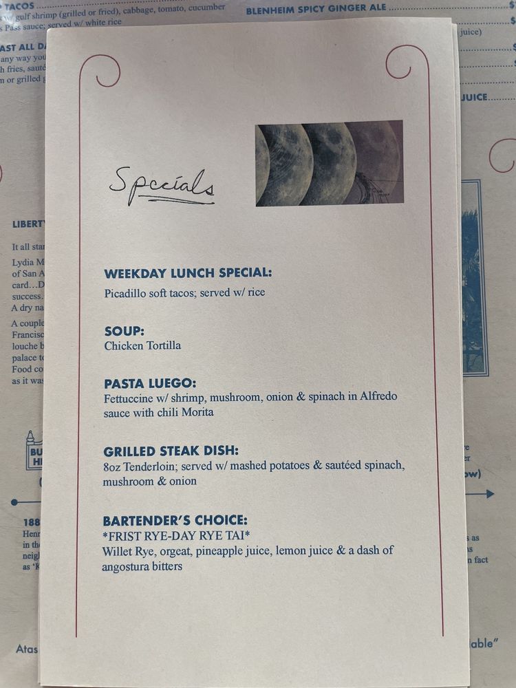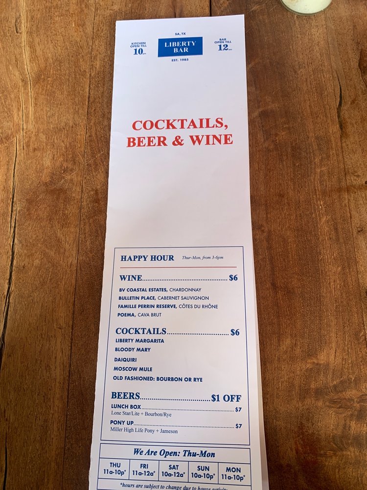 Daiquiri Moscow Mule Liberty Margarita Old Fashioned Well Bourbon or Rye Bloody Mary Lunch Box Lone Star or Lone Star Light w shot of Well Bourbon or Rye